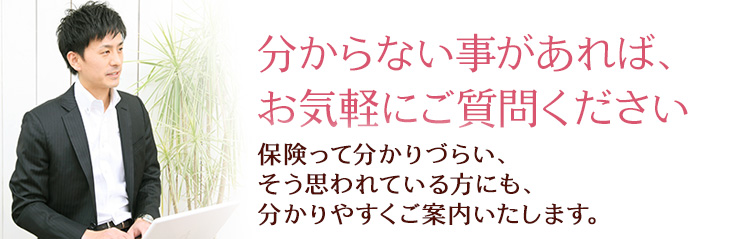 お客様のご希望に合わせ「お電話」「メール」「ご来店」「出張」にて保険のご相談をさせて頂きます。分からない事が御座いましたら何でも遠慮なくご質問ください。
