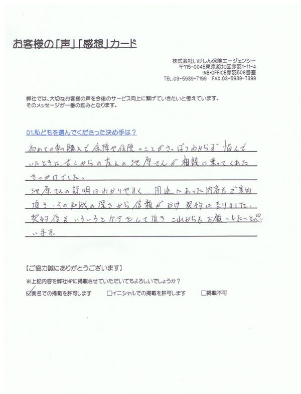 初めての車の購入で保障や保険のことがさっぱりわからず悩んでいたときに、古くからの友人の池原さんが相談に乗ってくれたきっかけでした。 池原さんの説明はかわりやすく、用途にあった内容でもご案内頂き、その知識の深さから信頼がおけ契約に至りました。 契約後もいろいろケアをして頂き、これからもお願いしたいと思います。