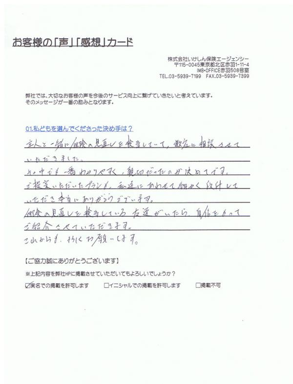 主人と一緒に保険の見直しを検討していて、数社に相談させていただきました。 その中でも一番わかりやすく、親切だったのが決めてです。 ご提案いただいたプランも、私達にあわせて細かく設計していただき本当にありがとうございます。 保険の見直しを検討している友達がいたら自信をもってご紹介させていただきます。 これからもよろしくお願いします。